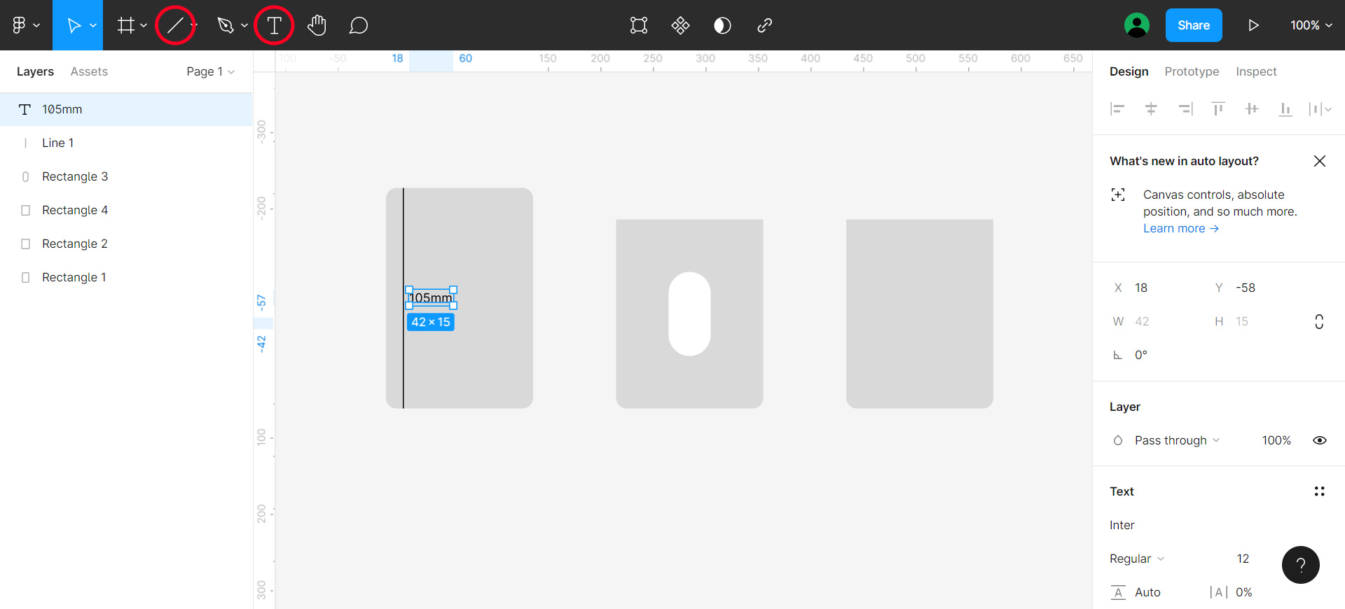 画面左上の「Line」ツールと「Text」ツールを使って図面に細かな寸法を記入していきます。